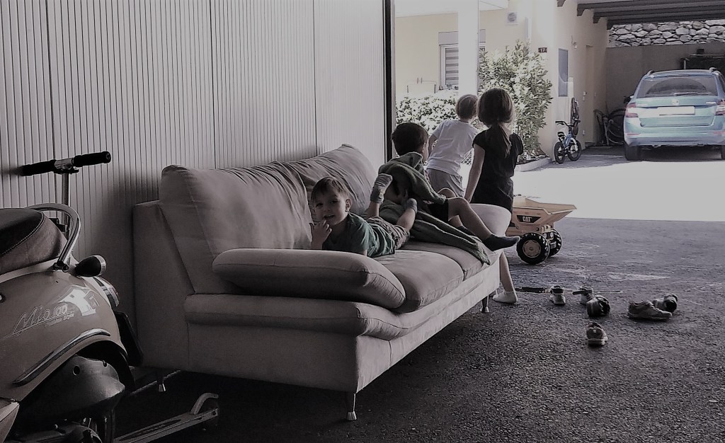 Tettoia del garage, ombra, aria. I quattro bambini saltano sul divano che sta lì da due mesi in attesa di qualcuno che se lo porti via a gratis; il Meo esce col casco e poi col martello; il Tony è arrivato da poco in bicicletta dopo dieci chilometri, scarsi, di pedalata assistita, sudato come sull’Izoard; la Regina e la Regina Madre sono in casa tranquille; io sto qua, sul divano vecchio, nella bufera di salti e grida a tentare di scrivere, ma non mi esce altro che questo verbale. È domenica pomeriggio, almeno sono già più avanti di Baglioni che invece è inchiodato per sempre al sabato, a piagnucolare con Leopardi.