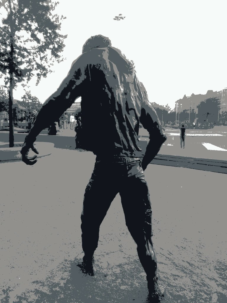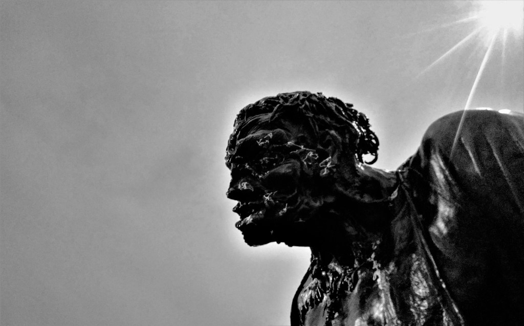 Cosa fai mostro al limitare di questo grande spazio? Tu, vituperato e temuto, mai amato da nessuno quando eri in vita, ora sei invece un gigante di bronzo, sbilenco nella tua andatura ma anche per questo maestoso. Io ti guardo sempre quando passo a Plainpalais, spesso mi avvicino e vorrei parlarti, ma mi metti ancora troppa soggezione. Sei bellissimo nella tua sofferenza eterna, che cominciò col ripudio da parte di tuo “padre”, che per dolore è secondo solamente al ripudio materno. Ma ti è stato scontato questo dolore, perché madre non avevi. Dunque cosa fai ancora su questa terra, che tanto ti ha oppresso scacciandoti dalle case, dalle piazze, dalle montagne, costringendoti a un rogo nei ghiacci del nord? Plainpalais pulsa di vita in modo irregolare, tra bancarelle, teatri, skateboard, fisarmoniche, camminato da uomini e donne di tutto il mondo. Col tuo passo sghembo non sembri in fuga, ma alla ricerca perenne di un contatto benevolo, nonostante il furore che ancora ti brucia il cuore. Ma non succede, non ti muovi, e quando giunge la notte resti solo in quel grande spazio circondato da alti casamenti. In quel momento arrivo io e sto un po’ con te, sempre senza parlare. Non mi guardi mai, ma sento che stai meglio e nella debole luce giallastra dei lampioni ti ergi in una regalità disperata che non ha pari. Anche il tuo volto, scavato da tutte le sofferenze possibili, appare disteso, e gli stracci che ti avvolgono si trasformano in indumenti principeschi. Il tuo andare è sempre sbieco, ma adesso sembra una finta di corpo all’emarginazione che patisti in vita. Un riscatto, ecco. Mi aspetto che un giorno, o meglio una notte, tu mi guardi e colga la profonda ammirazione per la tua resistenza, la compassione per il tuo dolore infinito che porti nelle membra e che ti impedisce di fermarti anche da immobile. Un giorno, una notte, mi guarderai e partiremo assieme. Io allineerò il mio passo banale al tuo incedere tanto insicuro quanto imponente e andremo chissà dove, oltre Plainpalais, verso qualcosa di buono. Te lo prometto. Aspettami mostro.