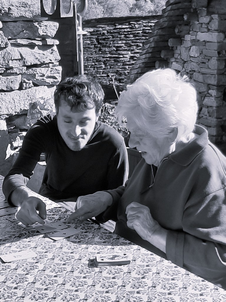 La terrazza è piena di sole, quel sole alpino che è ancora, almeno lui, benevolo e prezioso; la Mina sa che verso le quattro se ne andrà e si potranno finalmente bagnare i fiori. Nell’attesa, e dopo che il Meo è andato nel bosco a dare un po’ di martellate a un castagno, la Maddalena li invita a una partita alle carte. Di solito si svolge con il Meo che recalcitra a ogni presenza (Faccio da solo!), ma stavolta accetta di giocare con la nonna e si danno da fare come due bambini diligenti, insegnandosi a vicenda con spiegazioni criptate. La Mina ogni tanto vorrebbe imporre la sua saggezza, ma il Meo è anticlassista e non ascolta.