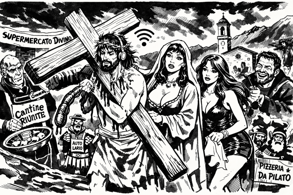 La processione commemorativa della Passione coinvolgeva figuranti, amici, parenti, curiosi e turisti. Grande tradizione in vigore da quattro secoli. Adattata eh. Ormai anche il Cireneo fustigava secondo le indicazioni dell’intelligenza artificiale. I legionari replicavano la truculenza spaccando le schiene con lunghe salamelle di capra. Il Cristo sanguinava col ketchup, attaccato al wi-fi per sentire Richie Havens e motivarsi di brutto. E la Madonna? Oh la madonna! Siliconata e gonfia alla bisogna, ma meno erotica della Maddalena che con sguardo languido sventolava la mini.