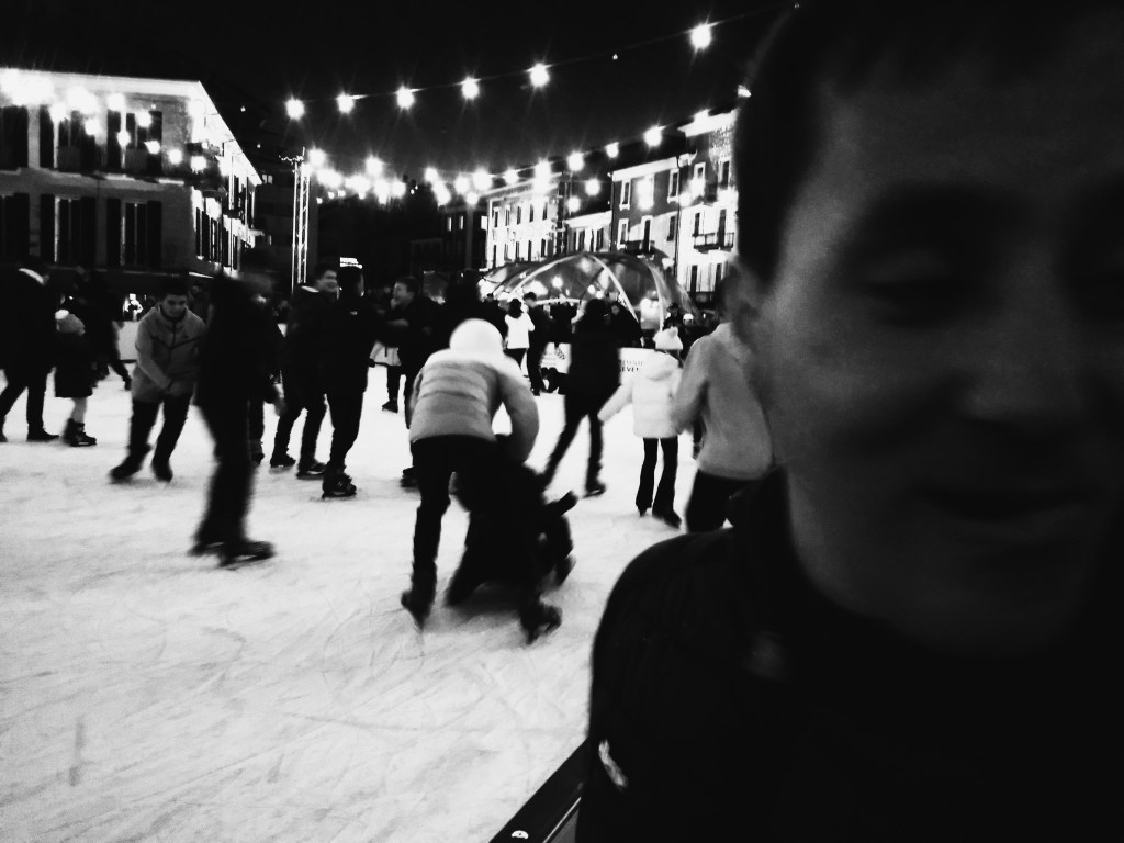 Nel pomeriggio che a novembre avanza verso il peso morto del crepuscolo, c’è ancora tempo per prendere il treno, in orario. Il Meo però, già sulla banchina della stanzioncina semipovera, vuole la sciarpa, che è in auto. Torna indré, ma la sciarpa non c’è, cristonamenti e alla fine arriviamo ancora alla stanzioncina a brucio. E via, Liverpool – Cadenazzo – Memphis – Giubiasco – Bellinzona. – Niente guggen! – No. In che mese arrivano? – Febbraio! – Ecco. Discendiamo il Viale della Stazione, che per la fortificata capitale sono i Campi Elisi, ma solo a volte. Oggi il piccolo sole non fa altro che stare sugli occhi, senza calore né pietà e nella piazza che ne porta il nome già è andato verso l’Atlantico. Il baraccone natalizio è ancora in fieri, la pista di ghiaccio è di legno e solo il maronát dà segni di vita, ma l’immancabile coda di tre persone indecise ci spinge in via Codeborgo dove ci potrebbe travolgere un ciclista alla prova della galleria del vento. Ma solo una carrozzina con la nonna esiste lì e il Meo allunga il passo perché i bambini lo atterriscono e vuole il Bar Piazza, che è vicino al Governo e incuba qualche pensiero migliore. Niente Omaltina. Due birre. – Io vado in treno. – Dopo. Il Meo arriva in un posto e subito vorrebbe partire verso un altro, è il suo spirito pioniere. E quindi, dopo aver assistito in tivù al finale di una vittoria dell’ACeBe, un miracolino, rimontiamo i Campi Elisi ancora più disadorni di prima. Sul treno il Meo si incazza, non vuole farsi fotografare, poi accetta come se niente fosse. – Io vado in teleferica. – C’è la neve. Smontiamo alla stazioncina e con fare domenicale riprendiamo l’auto fino alla verbana cittadella che qualche luce in più della fortificata capitale ce l’ha. Lì, la pista di pattinaggio natalizia è in funzione e tutti si urtano, padri che spingono in jeans da questoweeklotienitu e bambini a spazzaneve. – Sono matti! Il meo si appoggia alla balaustra tra fascino e apprensione per la giostra. – Io vado a pattinare. – Prendiamo i pattini? – No. Dice sempre di voler fare cose, bicicletta, sci, nuoto, però più tardi. Cioè domani, o mai. Quasi ora di cena, scendiamo i due scalini di legno e lui cade, un po’ goffo. Un signore lo aiuta a rialzarsi, non si è fatto niente e come premio andiamo per un crodino preliminare. Poi a cena, entrambi in linea con la tradizione invasiva della verbana cittadella, ci abboffiamo di pomfrit e scnizel. Gli chiedo ancora se gli fa male qualcosa per la caduta. Risponde di no, che mangerà il gelatino, e al gelatino ridiamo per l’incidente, spianato come il coyote, e che ridere, e per fortuna quell’uomo ti ha aiutato. Non sa nulla e non interessano bibbia e altre amenità spirituali, ma crede nell’amicizia e declama, riconoscente: – Il signore mi ha raccolto!