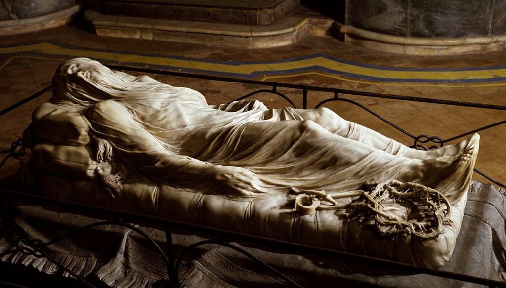 Ma al momento decisivo dei quattro giorni a Napoli, nella Cappella San Severo, appena poche ore prima della sublimazione lenitiva al Bar Sciò, non ho più potuto dire niente, di fronte a quella scultura supina, in candido marmo scolpito con una tecnica inimmaginabile se non la vedi coi tuoi occhi. Rappresenta un uomo morto, pietosamente coperto da un velo trasparente ma di marmo anch’esso e che non può nascondere, anzi lo rivela, il martirio di un corpo violato dalla ferocia di altri uomini, le mani e i piedi bucati, le vene rinsecchite, le labbra schiuse come se ancora del dolore insopprimibile ne uscisse, le braccia abbandonate e rigide nell’assenza di vita. Un uomo che racchiude in sé tutte le sofferenze dell’umanità, quelle di chi annega, di chi è accoltellato, di chi è divorato dalla malattia o frantumato dall’oppressione. Il sentimento è furioso e compresso, non cede alla retorica o all’estetica: le compendia per essere scarnificato fino all’origine di sé stesso. Non c’è sconto, non c’è redenzione in quest’opera finita che è così dedita all’atrocità della morte da riportarla alla vita.