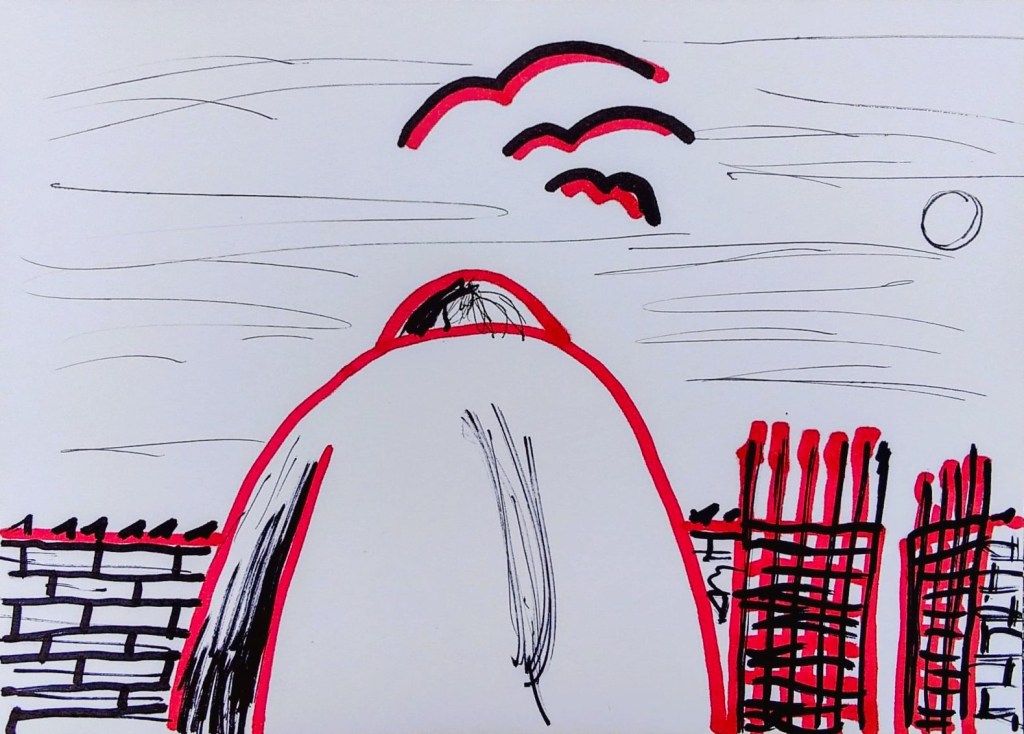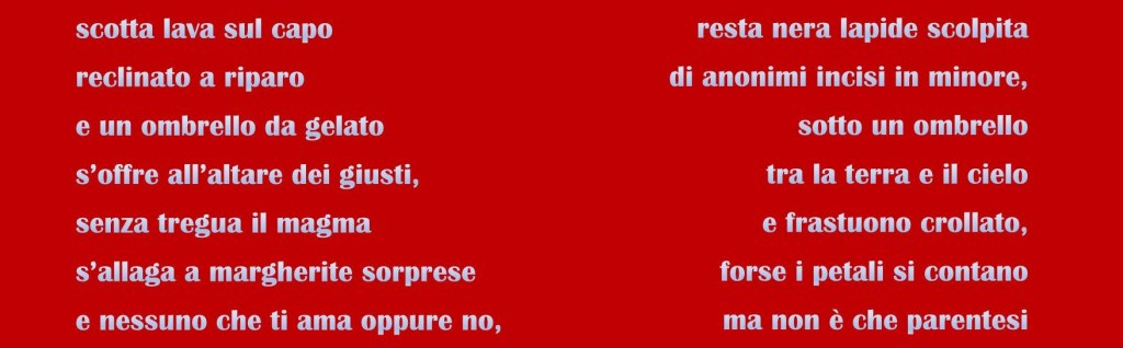 scotta lava sul capo reclinato a riparo e un ombrello da gelato s’offre all’altare dei giusti, senza tregua il magma s’allaga a margherite sorprese e nessuno che ti ama oppure no, resta nera lapide scolpita di anonimi incisi in minore, sotto un ombrello tra la terra e il cielo e frastuono crollato, forse i petali si contano ma non è che parentesi