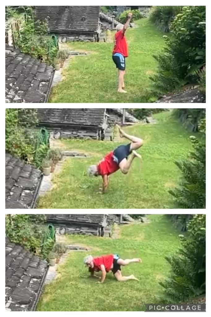 L’Esibizionista ha alzato le braccia, allargato le gambe, cercato la postura laterale e le migliori condizioni del vento e come nei grandi momenti delle conquiste umane ha lanciato le mani sulla soffice erba di giugno. I piedi sono saliti verso l’azzurro del cielo, come aironi nella corrente ascensionale d’aria tiepida, e dal punto più alto sono ricaduti al suolo trascinando l’Esibizionista verso la chiusura della figura. E come in tutti i momenti di conquista, quando ci sono frasi immortali che i posteri si tramanderanno per secoli, subito dopo aver ripreso contatto con la realtà, l’Esibizionista ha esclamato: